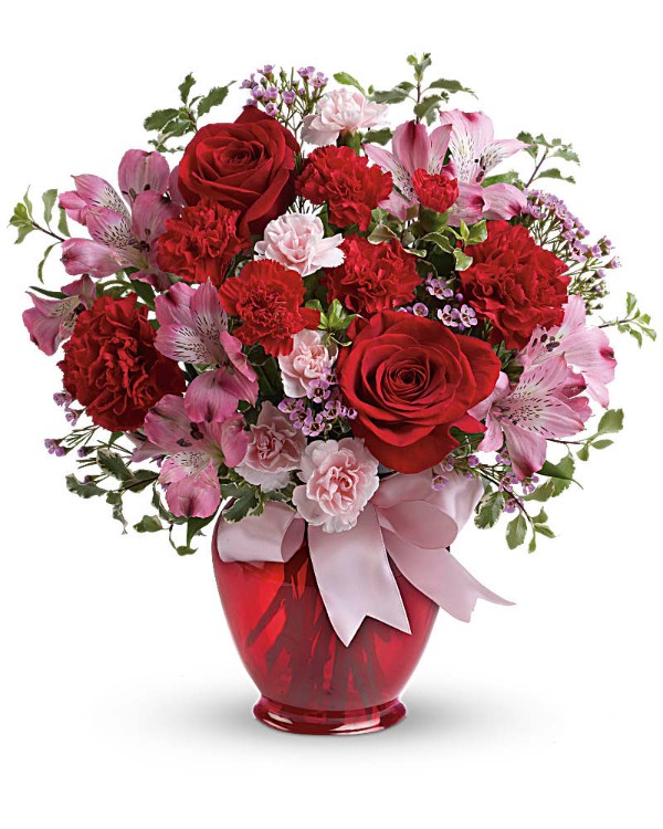 • Lush red roses, pink alstroemeria, red carnations, miniature red carnations, miniature pink carnations and pink waxflower are arranged with pitta negra and lemon leaf.